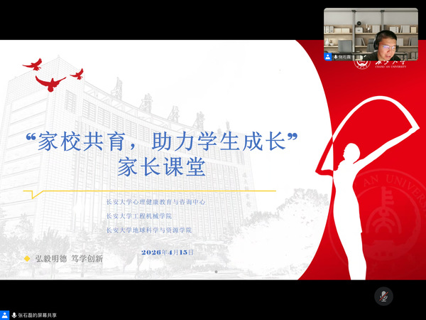 为深入推进心理育人工作,搭建家校协同育人平台,帮助家长科学应对孩子毕业季心理压力,凝聚家校育人合力,护航毕业生顺利成长,4月15日晚,工程机械学院联合地球科学与资源学院共同举办“家校共育,助力学生成长”本科生毕业班家长课堂专题讲座。本次讲座特邀学校心理健康教育与咨询中心副主任张石磊教授主讲,毕业班辅导员以及两院部分大四学生家长线上参会交流,活动由工程机械学院学生工作办公室主任倪生冬主持。