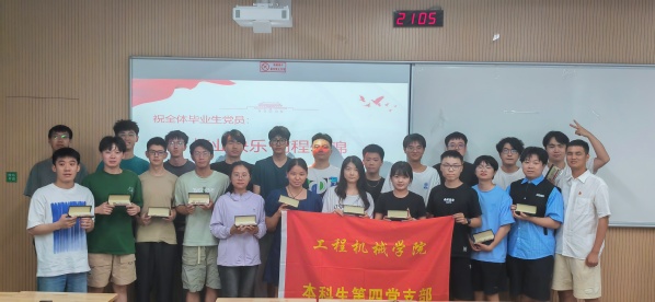 6月16日,工程机械学院本科生第五党支部于WX2202教室开展了毕业生党员教育暨毕业主题活动。支部书记王俊杰勉励大家要持续加强理论武装,站稳政治立场,将个人理想融入国家发展伟业,永葆奋斗精神,在各自的岗位上发挥先锋模范作用,同时要严守纪律规矩,扣好廉洁从业的“第一粒扣子”。最后由王俊杰向毕业生党员赠送毕业纪念品。