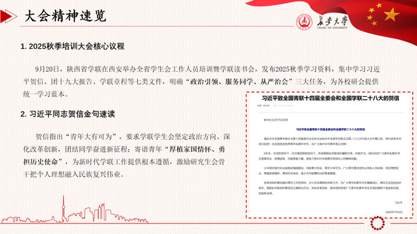 为深入贯彻落实陕西省学联2025年秋季学期培训工作要求,进一步提升研究生会成员的政治素养、服务能力和业务水平,工程机械学院研究生会于9月25日组织全体成员开展专题学习会议,会议聚焦“政治引领、服务同学、从严治会”三大核心任务,系统传达并部署落实培训精神。本次主题学习活动由研究生会执行主席张珍蕊主持,研究生会全体成员参加。