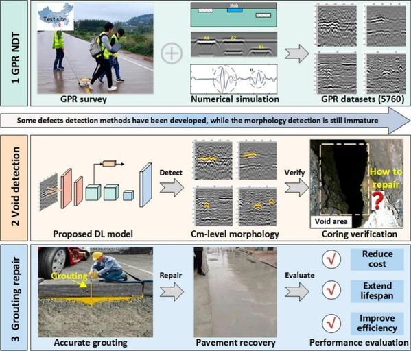 面对这一行业难题,团队成功研发出一种创新性的数据驱动框架,完美融合了探地雷达(GPR)与深度学习技术,实现了对水泥路面内部脱空从“厘米级精准识别”到“参数化精准修复”的一站式全流程智能解决方案(图1)。本技术的革命性在于,仅需读取探地雷达的原始数据,即可通过团队设计的深度学习架构进行智能分析,一键自动生成脱空体的精确三维“画像”——包括其形态、位置、深度、体积等关键参数,为后续的注浆修复提供了科学依据。