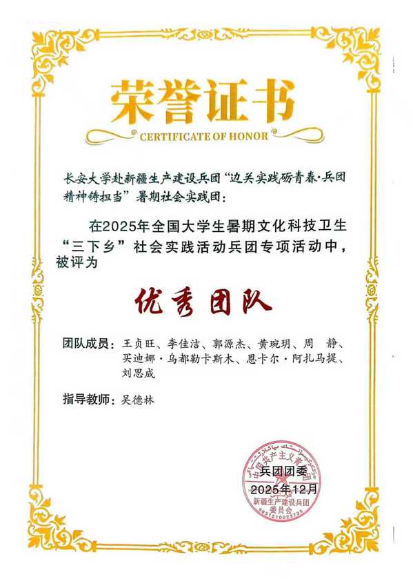 近日,在共青团新疆生产建设兵团委员会开展的2025年全国大学生暑期文化科技卫生“三下乡”社会实践“卫国戍边兵团行”兵团专项活动中,由工程机械学院师生组成的长安大学赴新疆生产建设兵团“边关实践砺青春·兵团精神筑担当”暑期社会实践团被评为“优秀团队”。